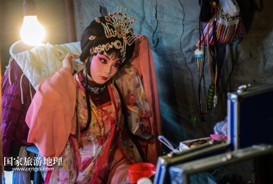 1月3日,武義壺山婺劇團演員在上臺前整理頭飾。