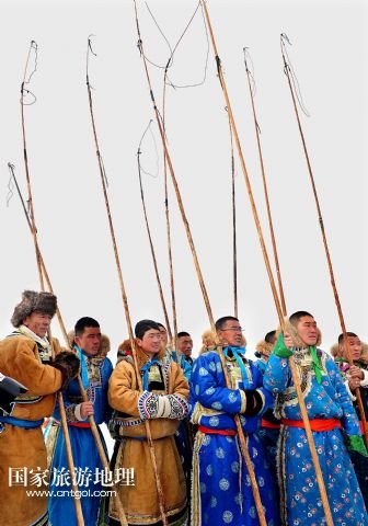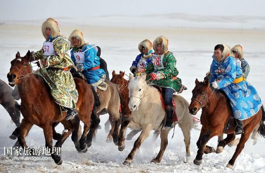 國家旅游地理 內(nèi)蒙古錫林郭勒1月5日訊 1月4日,牧民們?cè)谫愸R比賽中。當(dāng)日,2014年“銀色西烏珠穆沁”杰仁馬文化節(jié)在內(nèi)蒙古錫林郭勒盟西烏珠穆沁旗舉行。當(dāng)?shù)孛晒抛迥撩裆碇A麗的服飾,帶著自家的馬匹,冒著風(fēng)雪嚴(yán)寒,從四面八方趕到會(huì)場(chǎng),參加了賽馬、套馬、乘馬拾物、蒙古馬選美等多項(xiàng)比賽,吸引了來自全國各地的游客、攝影愛好者以及附近的大批牧民。 /新華社記者任軍川攝