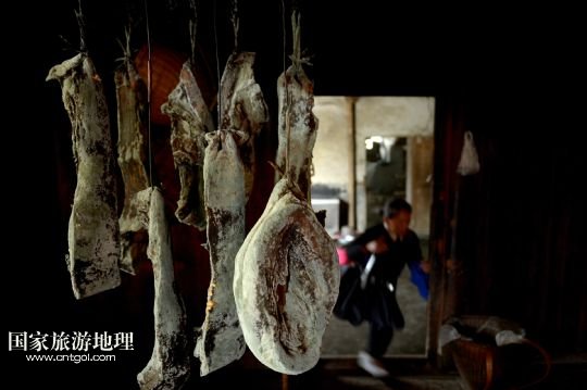 一戶板寮村農(nóng)家的屋中掛著當(dāng)?shù)氐膫鹘y(tǒng)食品——臘肉(5月22日攝)。