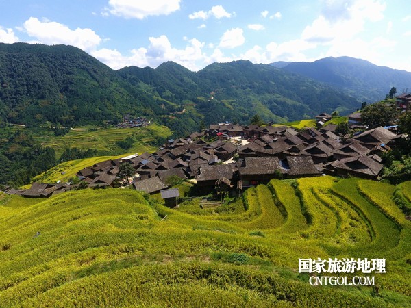9月5日,貴州省黔東南苗族侗族自治州從江縣加榜鄉(xiāng)黨扭村和加車(chē)村近萬(wàn)畝水稻開(kāi)鐮收割。圖為:鑲嵌在田園中的苗家吊腳樓。