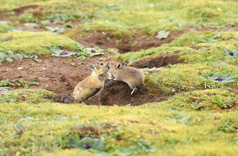 7月6日,兩只高原鼠兔在西藏思金拉錯湖邊嬉戲。